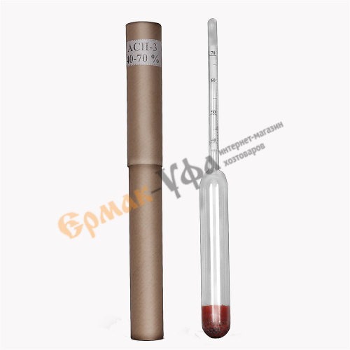 Спиртометр АСП-3 40-70% - лабораторный прибор, точно определяющий объемную долю этилового спирта, содержащегося в водном растворе. Данный спиртометр показывает процентное содержание этилового спирта в диапазоне от 40 до 70%. Для определения процентного содержания этилового спирта поместите сухой и чистый Спиртометр АСП-3 40-70% в емкость с жидкостью таким образом, чтобы он свободно плавал в ней, не касаясь стенок сосуда.