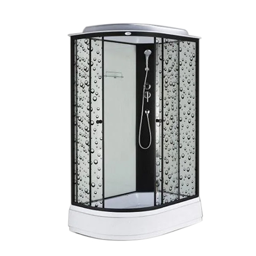 Задние стекла белые, в металлическом каркасе чёрного цвета, передние стекла прозрачные с рисунком КАПЛИ, толщина стекол 4 миллиметра. Высота поддона 25 см, ПОДДОН С БОРТИКОМ. Чёрная панель, чёрный алюминиевый каркас.