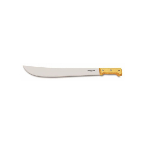 Мачете от TRAMONTINA большого размера. Клинок изготовлен из углеродистой стали SAE 1070. Лезвие отполировано и покрыто лаком для дополнительной коррозийной прочности. Рукоять из светлых пород дерева. Длина лезвия - 450 мм. Общая длина - 585 мм. Вес мачете - 505 гр. Толщина лезвия - 2 мм.
