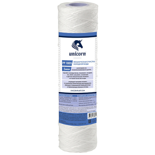 Картридж из п/п шнура для механической очистки воды Unicorn изготовлен из высококачественного полипропиленового шнура. Благодаря особой технологии сплетения шнура, крупные частицы загрязнений задерживаются на внешней стороне шнура, а более мелкие - во внутреннем слое, что позволяет продлить срок эксплуатации картриджа и улучшить потребительские качества воды. Удаляет из воды песок, ржавчину, осадок, ил, глину, окалину, суспензии и другие механические примеси.