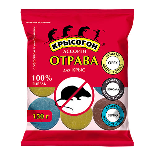 Средство родентицидное Крысогон представляет собой готовую пищевую приманку в виде таблетированных брикетов с влагостойкими свойствами различных цветов с натуральными пищевыми аттрактантами для привлечения грызунов. Обладают высокой родентицидной активностью в отношении серых крыс, домовых мышей, полевок и других грызунов. Натуральное пищевое сырье и ароматизаторы обеспечивают высокую поедаемость приманки грызунами с различными вкусовыми предпочтениями. В упаковке 3 вида таблеток-брикетов: бирюзового цвета (со вкусом зерна); цвета охра (со вкусом лесного ореха); коричневого цвета (с ароматом шоколада).
