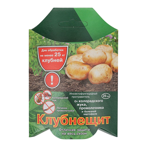 Инсектицид Клубнещит предназначен для борьбы с колорадским жуком, проволочником и различными болезнями картофеля, вызванными вредителями. Удобен и экономичен в применении.
