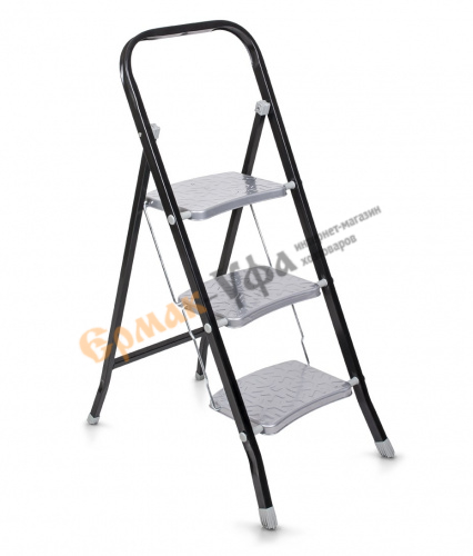 Ступени сделаны из прочной стали с резиновыми накладками, что очень облегчает использование стремянки и предотвращает скольжение.