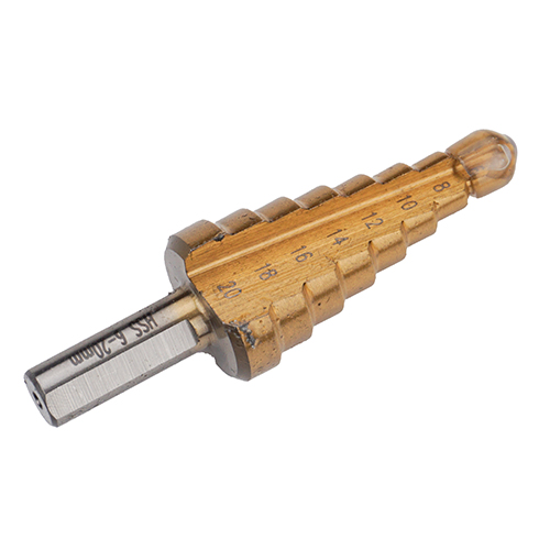 Ступенчатые сверла 6-20 мм 8 ступеней SPETSTEXNIK P6M5 предназначены для получения отверстий различного диаметра без перестановки режущей оснастки в цветном и тонколистном металле и твердом пластике. Конструкция сверла обеспечивает оптимальный отвод стружки из зоны сверления.