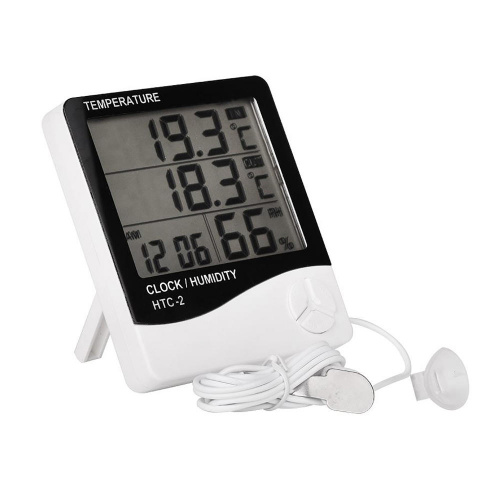 Цифровой термометр-гигрометр HTC-2 это комбинированный прибор для измерения температуры и влажности в помещении. Измеритель температуры и влажности воздуха используют для контроля параметров микроклимата в жилых, производственных и складских помещениях. С помощью крепежа, его можно повесить на стену, или использовать как настольную метеостанцию. Термо-гигрометр HTC-2 оснащен часами, имеет режим будильника и функцию памяти последних макс/мин., значений температуры и влажности воздуха. Все данные выводятся на большой ЖК дисплей крупными символами. Работу прибора обеспечивает 1 батарейка 1,5V AAA (мини пальчик), которая поставляется в комплекте с термо-гигрометром.