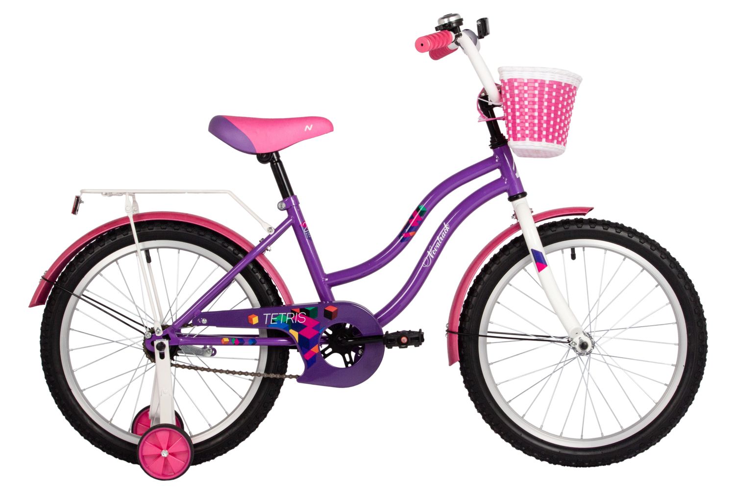 Велосипед NOVATRACK 20, TETRIS фиолетовый, тормоз нож, крылья цвет, багажник, корзина, защ.це